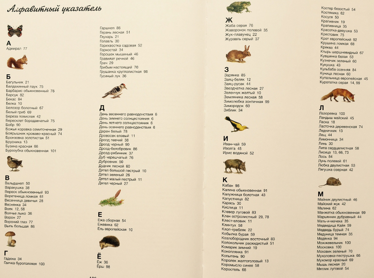А также алфавитный указатель зверей-птиц-насекомых-растений, упоминаемых в книге, со сносками на соответствующие страницы.