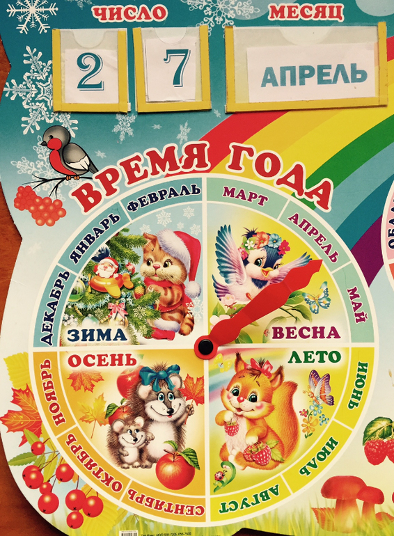 На нем мы каждый день отмечали, какая за окном погода, какой день недели. Выставляли стрелками текущий месяц и время года, а для закрепления знаний Олеся меняла цифры и карточку с названием месяца в "окошках". Цифры она знает давно, а вот нужный месяц выбрать помогала ей я, конечно. И вот совсем недавно наступил момент, когда дочка смогла самостоятельно прочесть название месяца (сейчас ей 3 и 10).