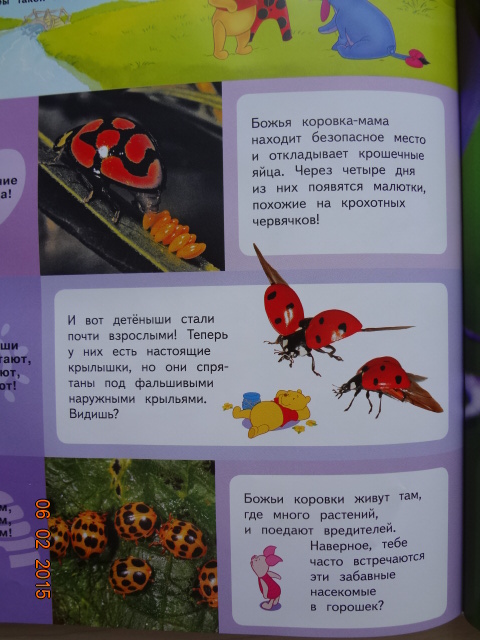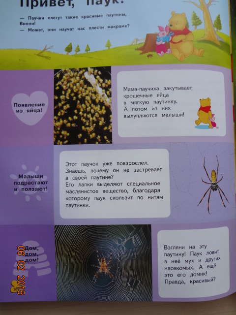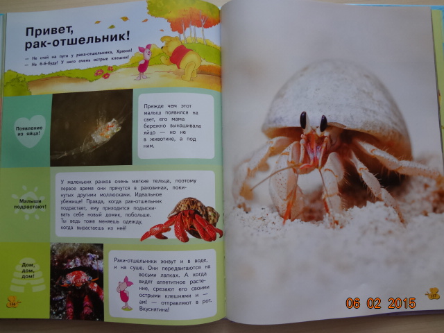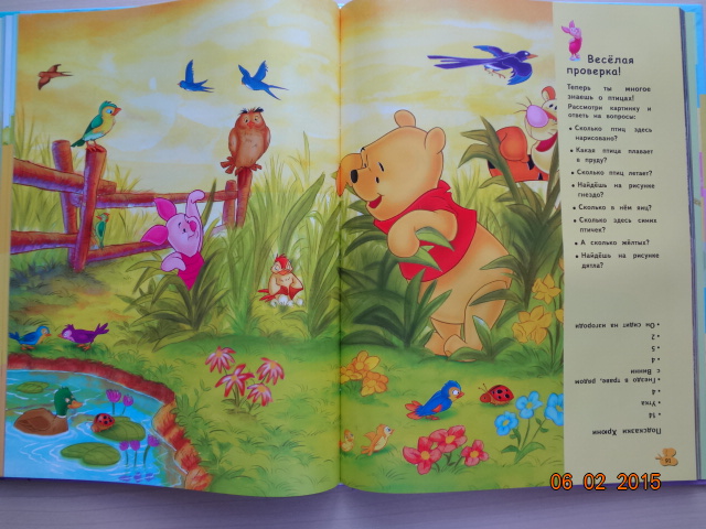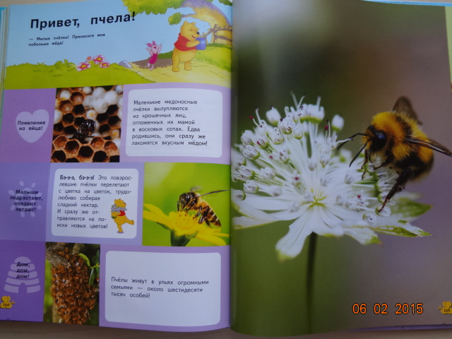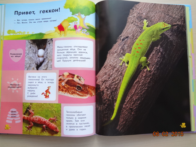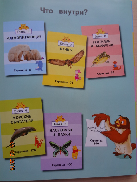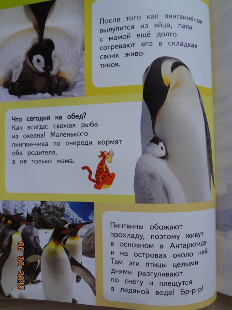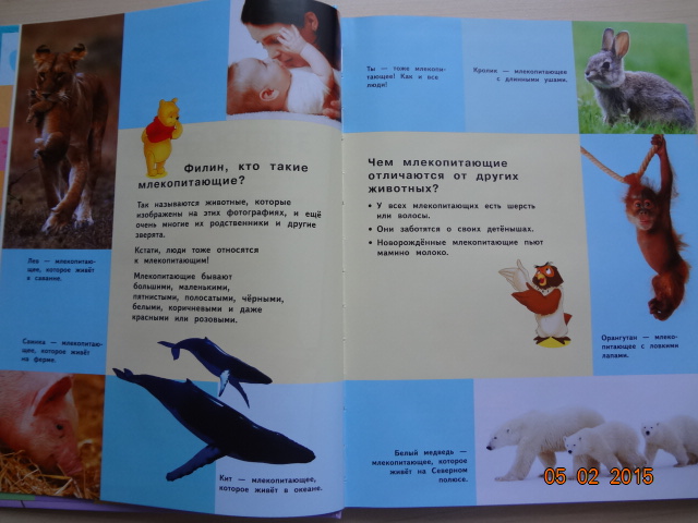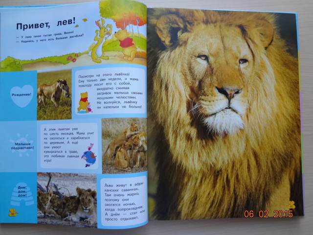 Информация дана в форме игры - диалога между героями диснеевского «Винни-Пуха». Сама энциклопедия мне очень понравилась, не могла оторваться пока не прочитала последнюю страницу) Книги получилась очень красочной благодаря прекрасным фотографиям. Каждому животному посвящён целый разворот. На одной странице дана очень краткая информация о животном, буквально несколько предложений о рождении, малыши подрастают и их доме. А на другой странице дана полностраничная красочная фотография.