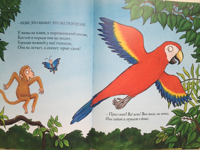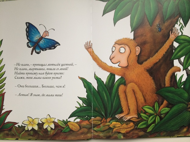 Замечательная и забавная история о том как обезьянка потерялась и искала свою маму, а помогал ей в этом мотылек, предлагая различных мам.
