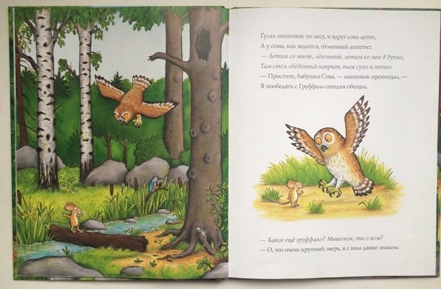 Эта сказка про маленького мышонка, который идет через дремучий лес. На пути ему встречаются лиса, сова, змея, которые завлекают его на совместный завтрак, обед и ужин явно имея планы полакомиться самим мышонком.