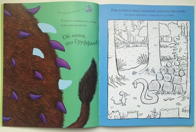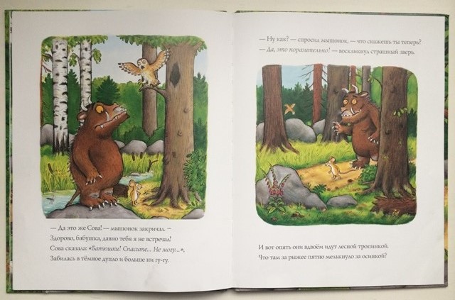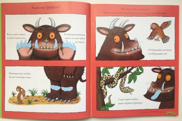 История забавная, но я знаю что есть противники этой книги, мол страшненький этот Груффало очень. По этому поводу могу сказать следующее, есть у нас парочка книг, читая которые (ниже напишу какие) был период, что Лёня временно боялся, но потом это прошло. Так вот Груффало никак к ним не относится, Лёня обожает его с самого начала и по сей день. А над стихами у нас даже бабушка хохочет, выучила и рассказывает Лёне наизусть))