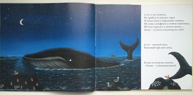 Эту книгу однозначно стоит прочесть каждому ребенку. Очень милая история дружбы Кита-великана и малютки-Улитки учит маленького слушателя быть добрым и отзывчивым.