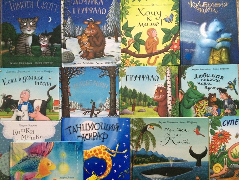 Никого не удивлю, но как и у многих тут у нас лидируют произведения трио Дональдсон-Шеффлер-Бородицкая. Джулия Дональдсон пишет просто замечательные местами трогательные, местами поучительные, местами просто смешные стихи, которые переводит для нас не менее замечательная Марина Бородицкая. Начали мы собирать коллекцию, когда Лёне еще не было и года. Признаться я боялась, что ему не хватит усидчивости, все-таки в каждой книги довольно длинное стихотворение, но уже в год Лёня с удовольствием слушал всю книжку от начала и до конца и просил еще, еще, еще... Возможно, отчасти, это также заслуга и иллюстратора, каждый разворот книги произведение, столько красок и деталей, красота в общем.