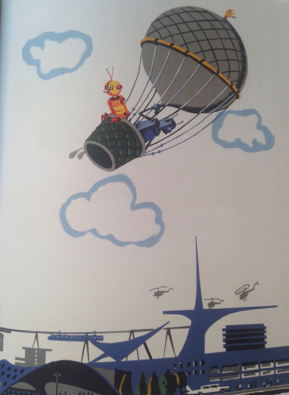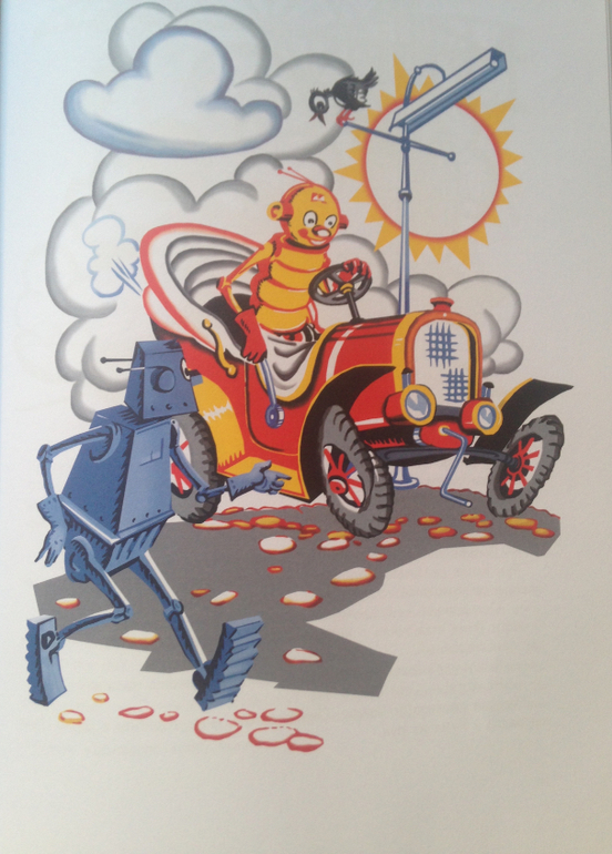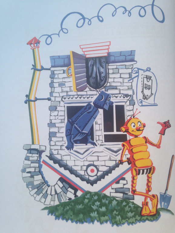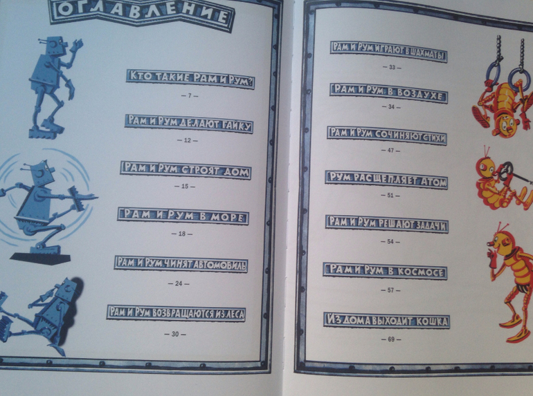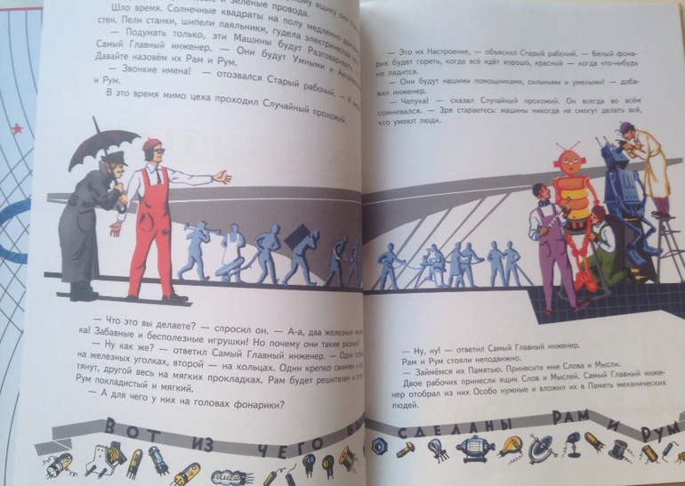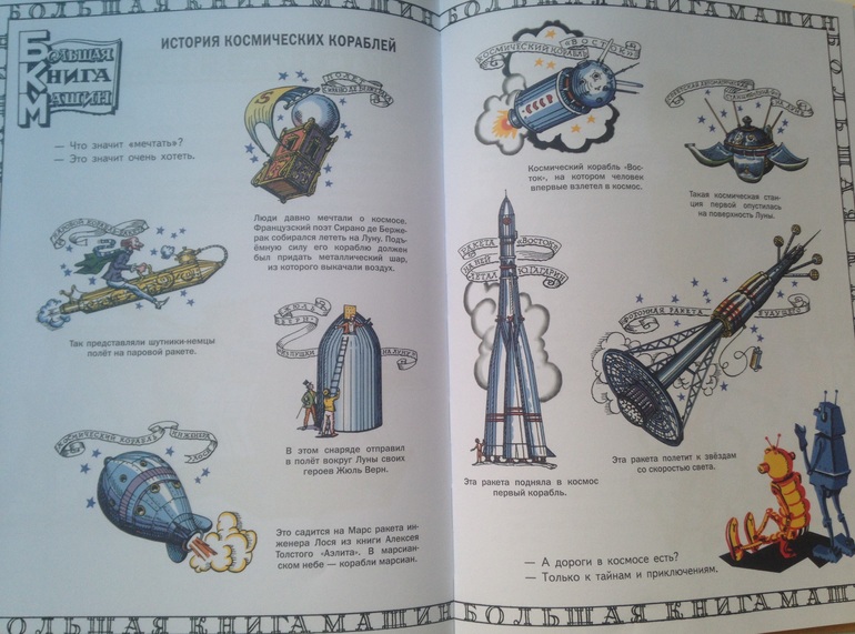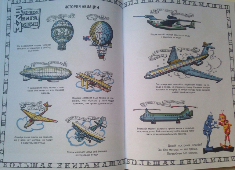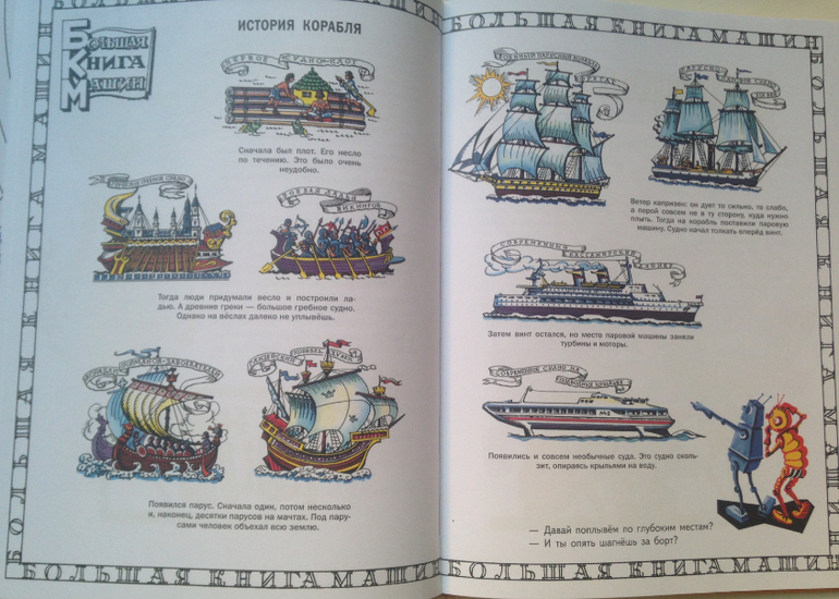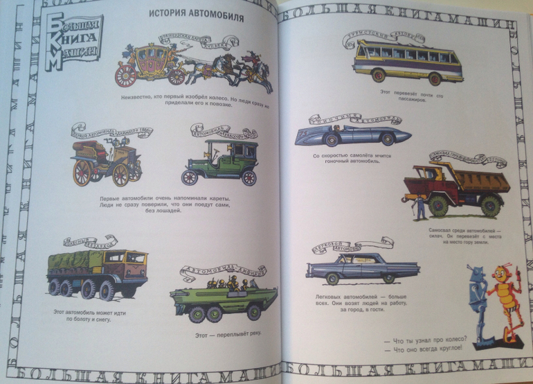 4 разворота оформлены вставками из воображаемой " Большой книги машин". Это энциклопедия, которую дал роботам инженер для изучения техники. В ней отражена история кораблей, автомобилей, самолетов и ракет. Коротко и понятно даны названия и период их использования. Эти развороты распологаются в главах, где роботам дают задание связанное с определенным видом транспорта.