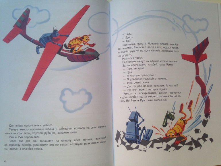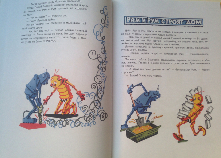 Хочу рассказать о книге, которую купила год назад после отзыва мамы девочки. Ей так интересна была история двух роботов, что я решила, уж мальчику такую книгу просто обязательно надо купить. Мальчик мой в 3 года книгой увлекся, но рассматривал исключительно картинки, их на тему автомобилей, летательных аппаратов и прочей техники предостаточно. Историю прочли в 3,10 с удовольствием. И я теперь понимаю, почему девочке было интересно. Рам и Рум не просто роботы, они друзья, они с ярко выраженным темпераментом, противоположным друг другу, они заботятся друг о друге и приходят на выручку.