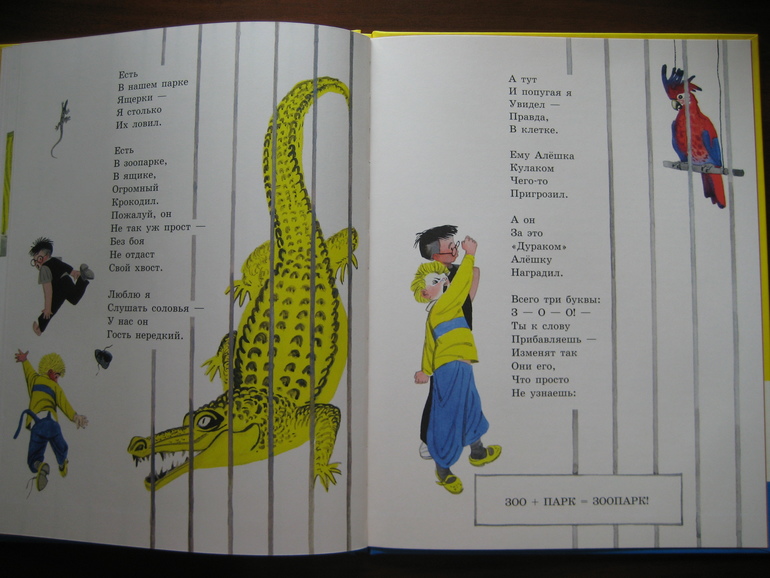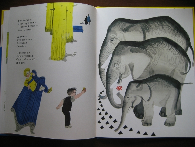Не устаю удивляться, насколько разной может быть художественная манера у Владимира Гальдяева: здесь, например, иллюстрации очень яркие, насыщенные, забавные и ироничные - под стать стихам! :) Удачно, что бумага выбрана не белая - легкий бежеватый тон снижает контрастность и рисунки смотрятся выигрышнее, во-первых, и читать комфортнее, во-вторых.