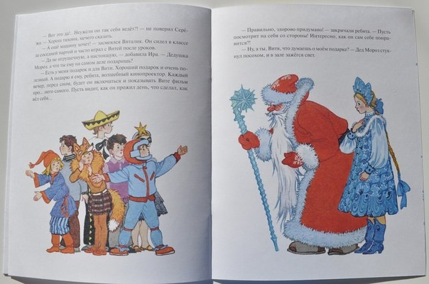 И можете себе представить, что однажды Дед Мороз познакомился с мальчиком Витей, который не хотел делать уроки и швырялся учебниками. Оказалось, что Витя только дома такой грубиян и лентяй, а в классе он слывет тихоней. И вот решил Дед Мороз открыть одноклассникам правду о Вите и на новогодней елке показал детям фильм. Настоящее чудо! Каждый увидел в этом фильме себя за любимым занятием. И вот все охнули. На экране появился Витя, разбрасывающийся учебниками и топающий ногами. Неприятное открытие! Витя застыдился и убежал. Но Дед Мороз и его не оставил без подарка - он подарил ему… кинопроектор, который будет показывать Вите как он провел день, как он себя вел. Со стороны на себя посмотреть бывает очень полезно!