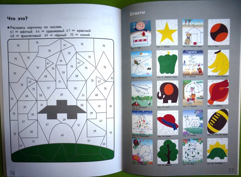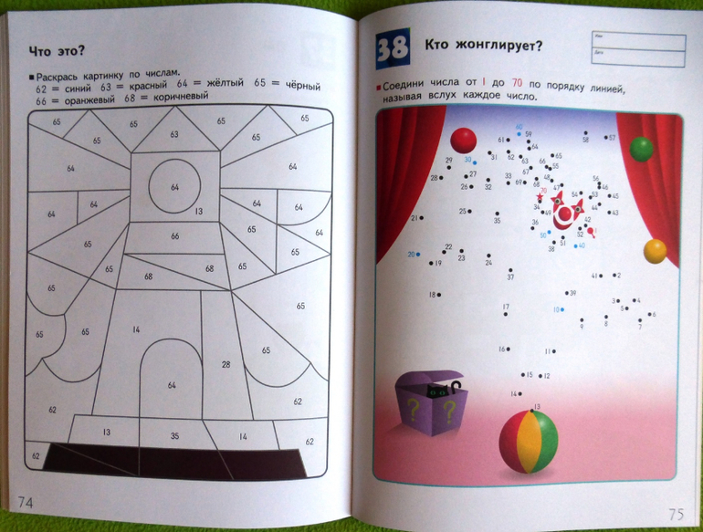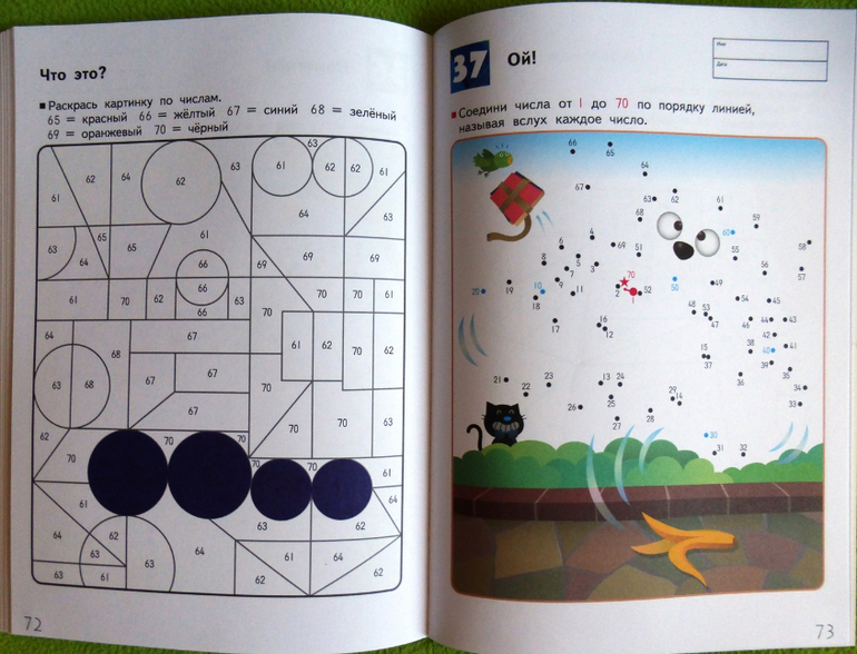 На нечетных страницах задания, в которых требуется соединить числа по порядку, а на четных страницах картинки для раскрашивания по номерам, которые помогут одновременно развить и навык узнавания чисел, и мелкую моторику. Во время выполнения этих упражнений ребенок должен называть числа вслух. Цель этой рабочей тетради - научить ребенка оперировать числами от 1 до 70. Приобретенный навык поможет ему приступить к изучению основ математики.