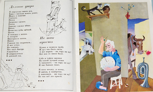 Книжки нашего детстваЧудесная книжка размера А4 со стихами еврейского поэта Овсея Дриза в переводе Генриха Сапгира. Делают книгу имхо оригинальные иллюстрации Виктора Пивоварова. Они и сегодня бы были свежими на фоне серий про "мамину книжку".