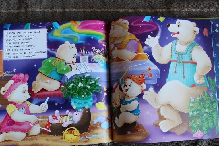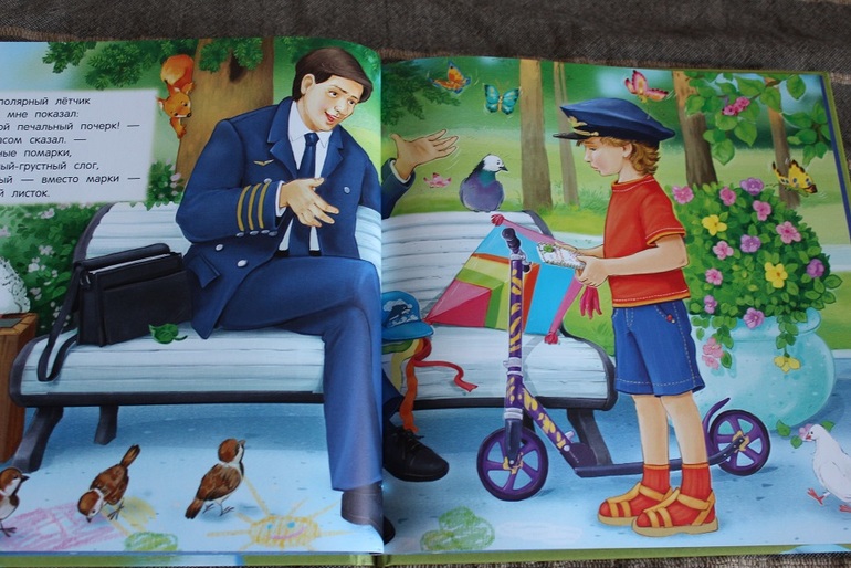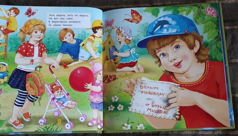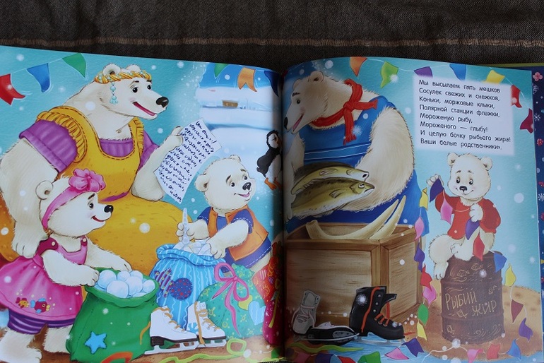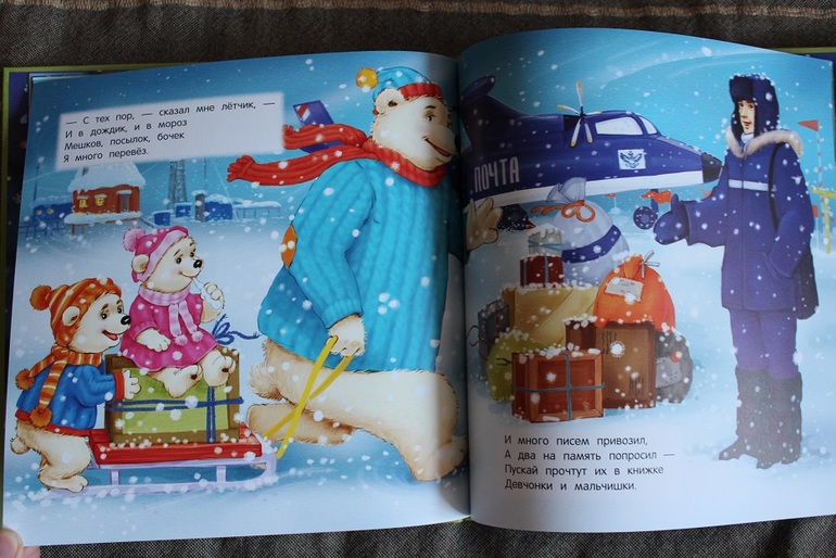 А "Почтовая история" такая: летчик рассказывает мальчику о необычной дружбе по переписке белых мишек и бурых. Бурые, увидев в газете белых на льдине, подумали, что те практически погибают от голода и холода. И срочно собрали им посылочку - меду, валенок, соломки… Сопроводив все это заботливым рифмованным письмом.