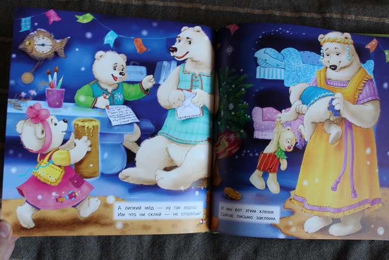 Хапнув книжечку - яркую, добрую, позитивную и умилительную (и кстати, дюже смешную), я подумала - ну точно ведь новогодняя. На картинках елки, льдинки, белые мишки, подарки-посылки… Но оказалось, что про Новый год тут ничего и нет. Хотя чувство праздника остается на протяжении всей книги - ведь она о верности, дружбе и трепетной заботе сквозь расстояния.