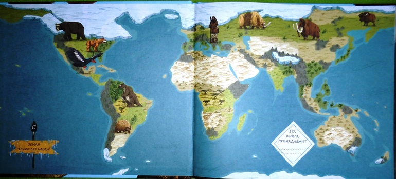 Во времена ледникового периода детеныш бизона Тоби жил в Северной Америке, а животные гиганты, с которыми он познакомился, обитали в самых разных уголках нашей планеты. Для наглядности, форзац книги оформлен в виде карты Земли 15 000 лет назад. Рассматривая его, можно понять на каких континентах жили животные-гиганты того времени.