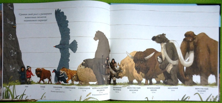 На каждой странице есть картинка, где видно соотношение размеров животных и современного человека.