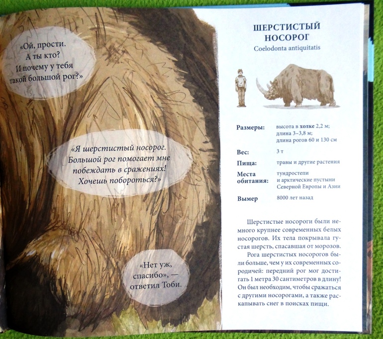 Это книга по палеонтологии для всей семьи. Необычный формат ее в виде познавательного комикса делает книгу яркой и запоминающейся. Издание подходит и для детей, которые только что научились читать, т.к. шрифт в книге достаточно крупный, буква «ё» присутствует.