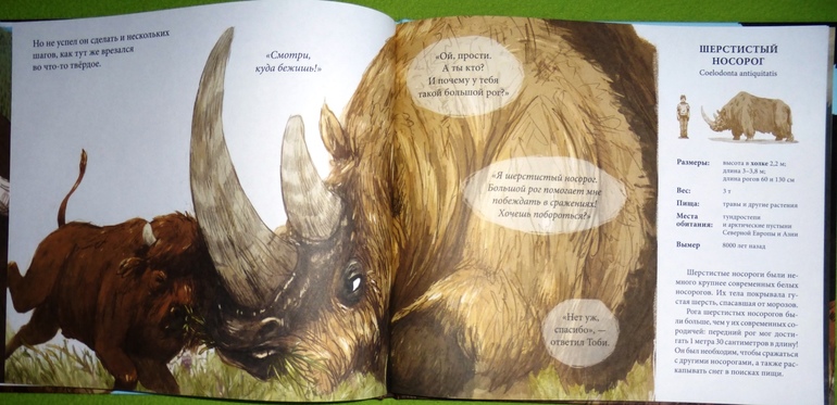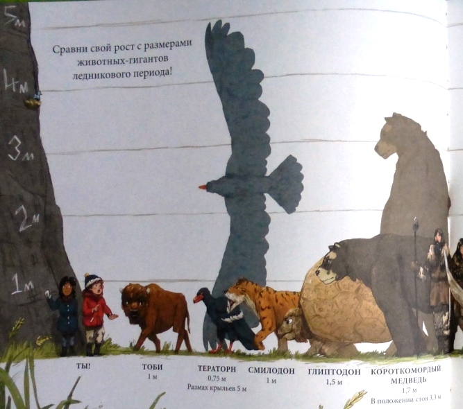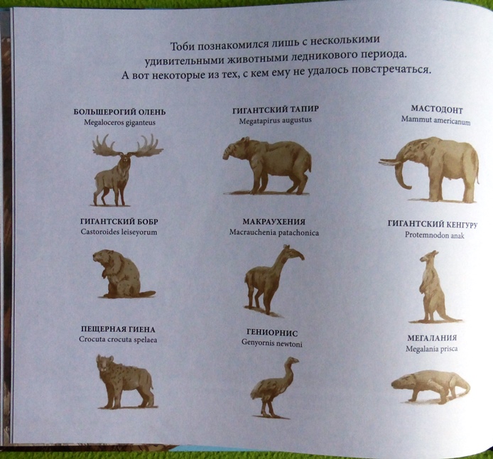 Малыш Тоби в книге встречает 9 животных ледникового периода и древнего человека, но в книге есть еще интересная страничка, где перечислены и изображены обитатели того периода с которыми маленький бизон не повстречался.