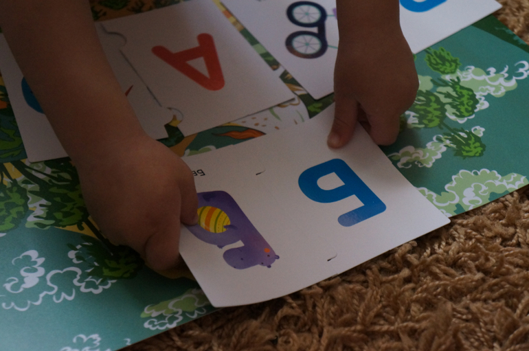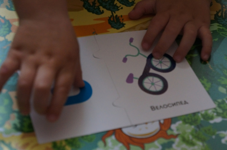 Каждая пара имеет свой уникальный замочек. То есть, если ребенок подберет к букве или картинке неправильную пару, то пазл не сложится.