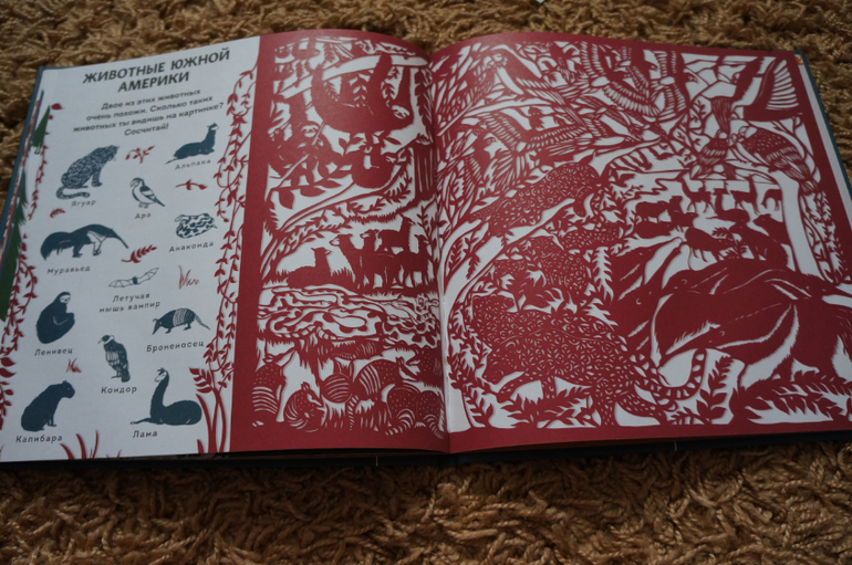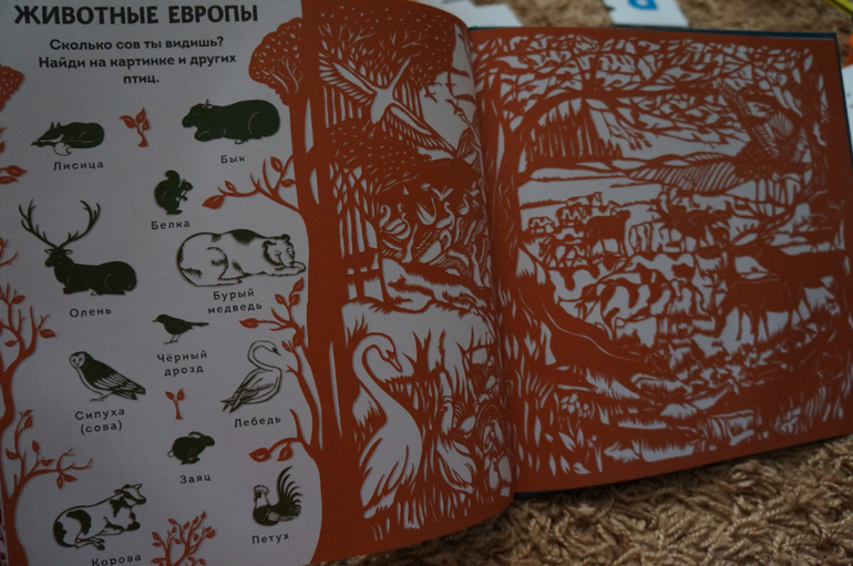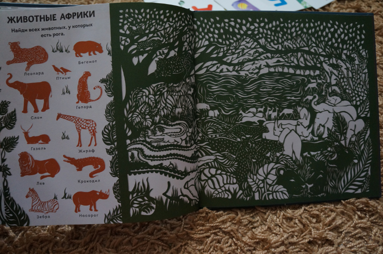 Иллюстрации очень насыщенные, много разные животных, много действий и много животных. Можно рассматривать, искать и считать долго спрятавшихся животных в ажурных иллюстрациях.