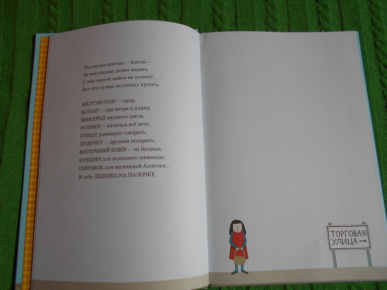В стихотворной форме мы отправляемся с девочкой Китти на Торговую улицу за покупками. У неё есть большой список покупок и , сверяясь со списком, в каждом магазине мы покупаем самые разные вещи - шланг, ролики , леденец, пирожок, виноград, птицу, дудочку, ковёр, кувшин, необычные такие покупки ))