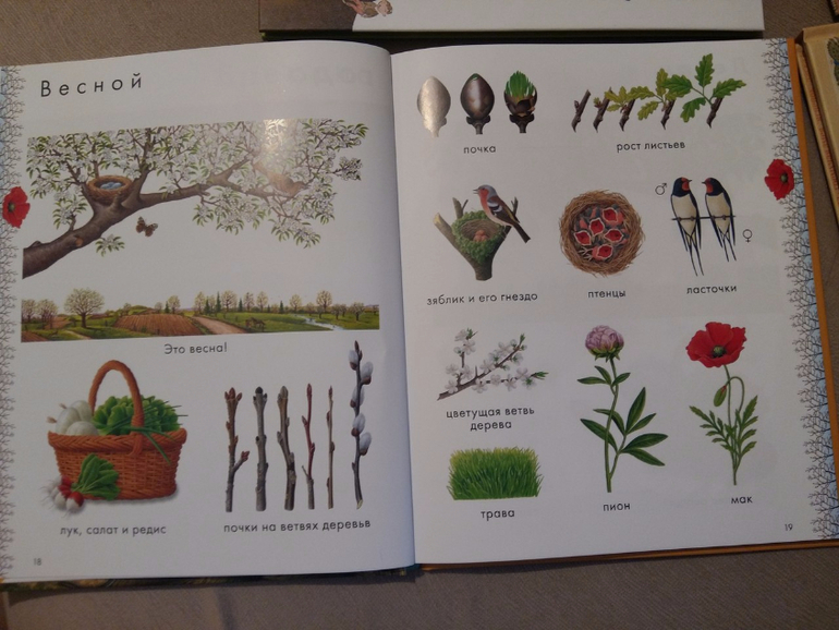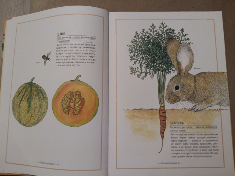 Иллюстрированные справочники "Животные" и "Дары природы" тоже интересные, рисунки другие, не такие красочные и бумага другая. По большей части животные дубляж. А вот "дары природы" интересная книга. Но не понятно расположение рисунков на странице. Как-то фрукт и тут же овощ. Почему издатель так расположил? Я бы хотела так же как "Животные" деление растений по полосам.