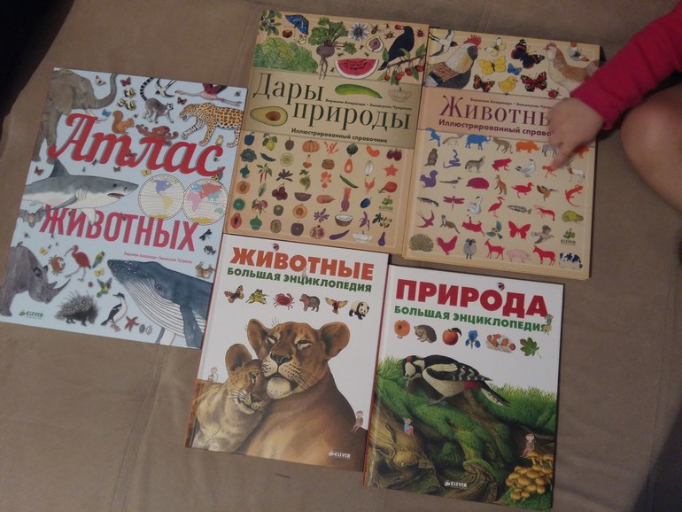 Но теперь о книгах. 5 энциклопедических книг на вырост. Я бы назвала их книги гляделки. Информации или мало или нет совсем. Но иллюстрации прелесть. Особенно я в восторге от энциклопедий "Животные" и "Природа". Они прекрасны. Я сама их рассматривала очень долго. Очень все красочно нарисовано.
