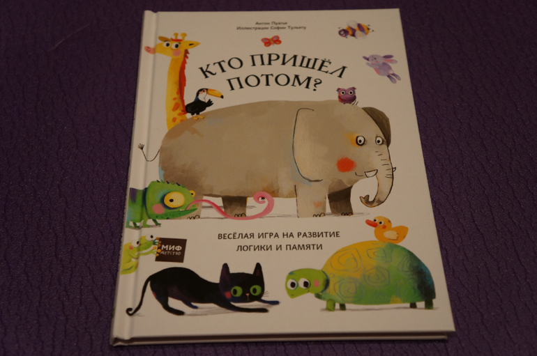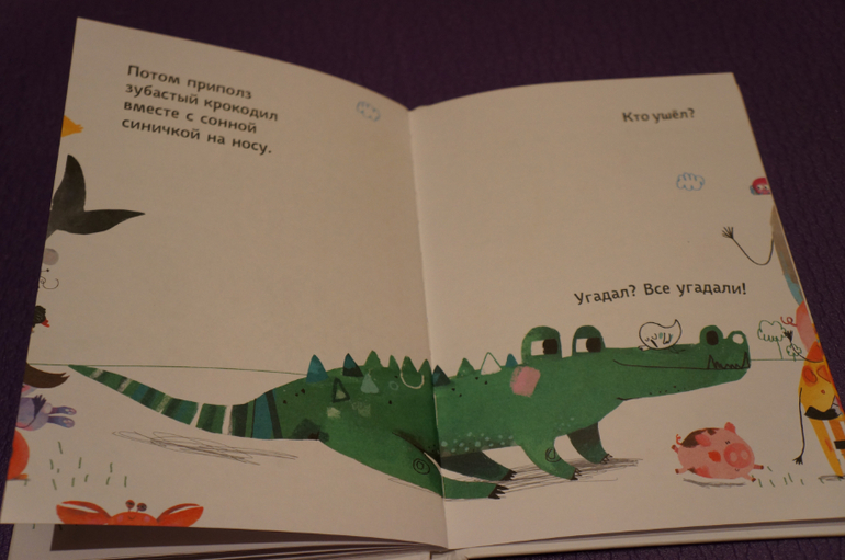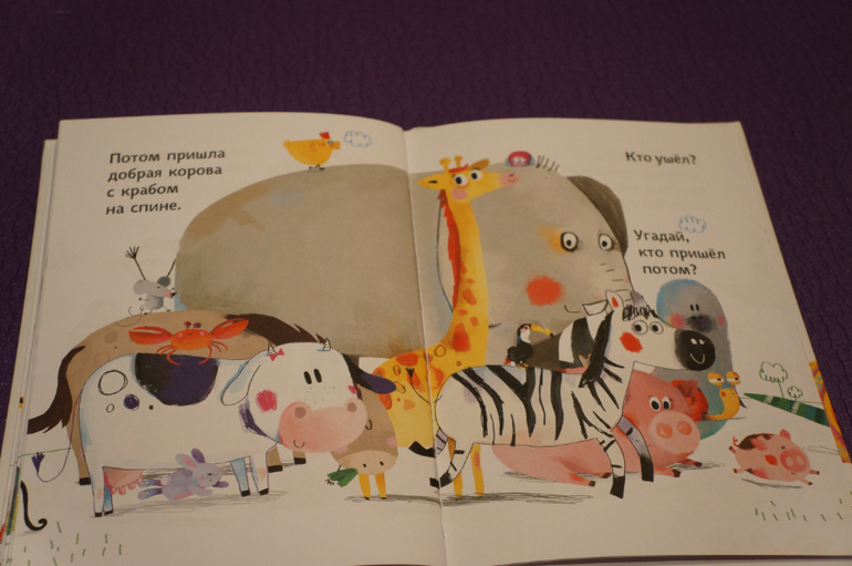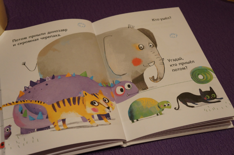 Это веселая книга-игра. На каждом развороте какое-то животное приходит и какое-то уходит. При этом читатель может видеть только часть приходящего\уходящего, нужно озвучить кто ушел и пришел, используя свое логическое мышление, память, смекалку или просто фантазию :))))