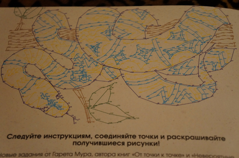 Изюминка заключается в необходимости думать :) Это не просто соединяем все цифры, как в детской раскраске. Точки показаны разнообразными значками, в зависимости от которых нужно соединить линию или прервать. На первой странице есть подробная инструкция и графический образец.