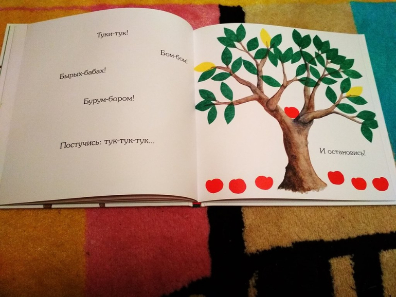 Интерактивность книги в заданиях. На каждой странице есть задания, надо то постучать по дереву, то погладить, то потереть, то потрясти...