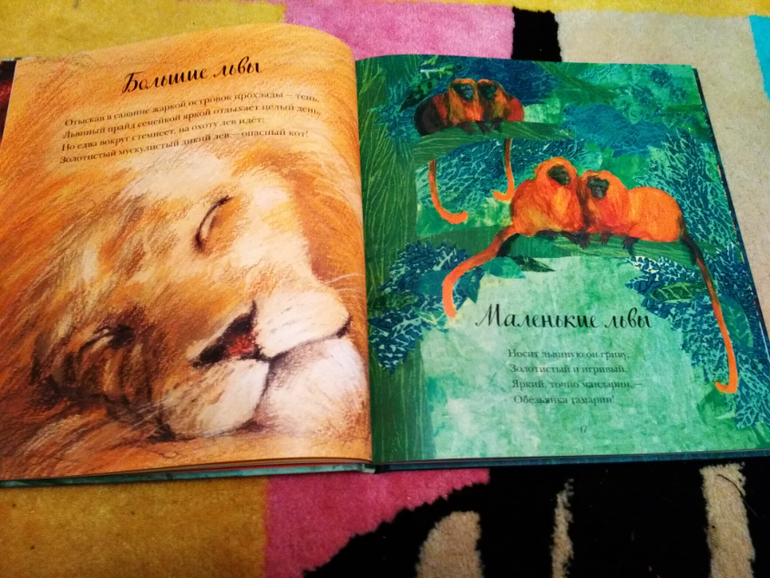 Более 100 страниц о разных животных, рыбах, рептилиях, насекомых и птицах. Каждому отводится отдельный разворот, посвящается стихотворение и красивая иллюстрация.