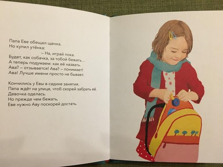 Книга о Еве, которая мечтала, чтобы ей купили собаку. Но папа дарит девочке утку! А Ева представляет, что утка может оказаться щенком и стать лучшим другом.