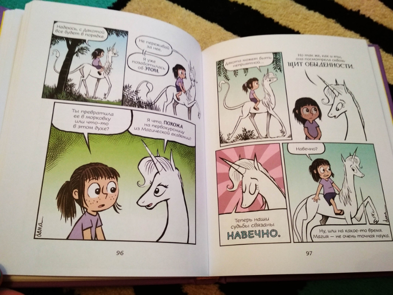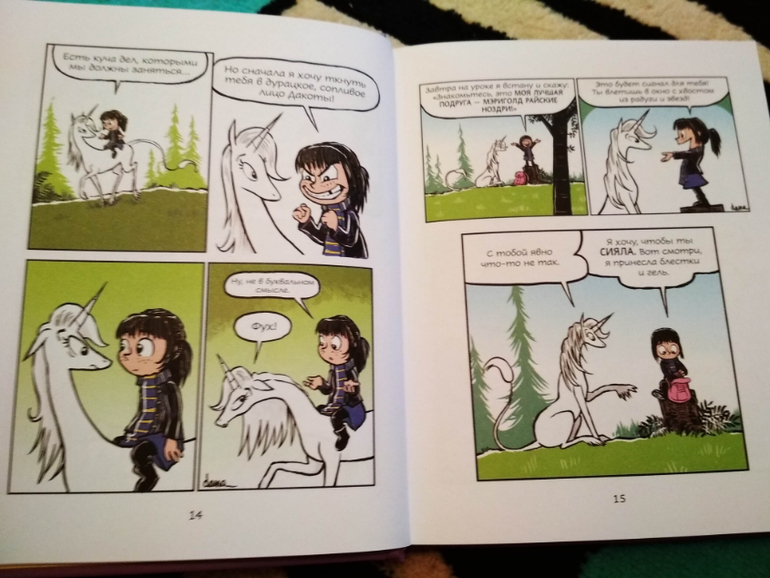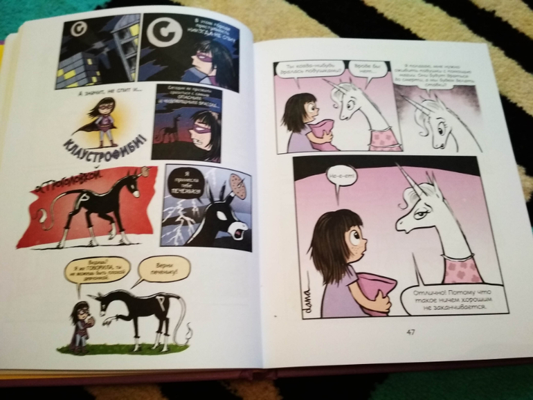 Дочери почти 9 лет брала книгу с собой в отпуск и прочитала за 2 вечера. Более 200 страниц смешных историй о волшебном единороге, о странной и настоящей дружбе, о истинах, о серьезных вещах и выдумках...