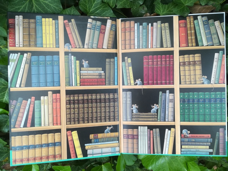 «Мартин, Малыш и Говорящая книга: история старой библиотеки», Анн Жонас, иллюстрации Франсуа Кроза. Когда эта книга попалась мне на глаза, невозможно было ею не заинтересоваться. С обложки на меня смотрел очаровательный зеленоглазый кот, созданный легендой французской книжной иллюстрации. Но, как оказалось, главный герой вовсе не он, а маленький едва заметный мышонок. Форзац книги - полки снизу доверху заставленные книгами.