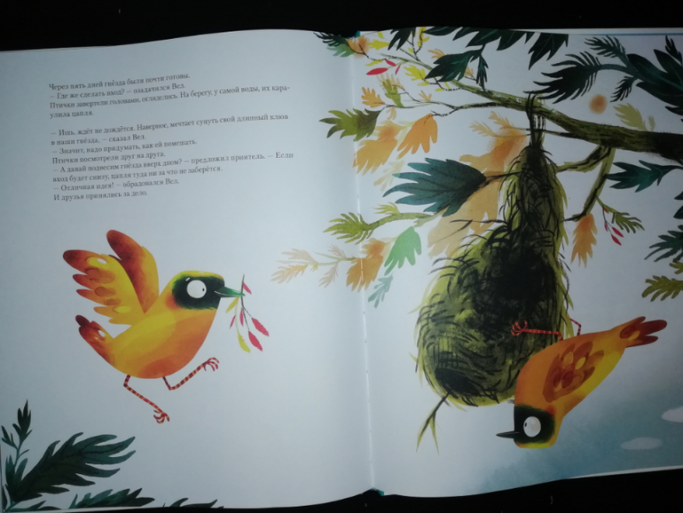 Как я уже писала ранее, в книге десять рассказов, все они про разных птиц и посвящены поиску счастья, уверенности в себе, умению дружить, делиться, помогать и другим положительным качествам. Есть небольшие сноски с энциклопедическими знаниями про каждую птичку, где живет, что интересного про нее можно сказать и т.п.