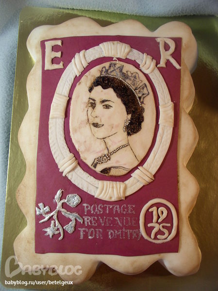 она вся такая, немного покоцанная:) марка... ну, типа не самая новая:) а орнамент не серебряный на самом деле, на белой мастике прорисованы линии черным пищевым фломастером... там четыре цветка — четыре символа британского королевского дома: лииля, трилистник, роза, чертополох. Наверное, було лучше не вырезать, а нарисовать, но белого красителя у меня нет, только серебристый.. он бы тут лишним совсем был....