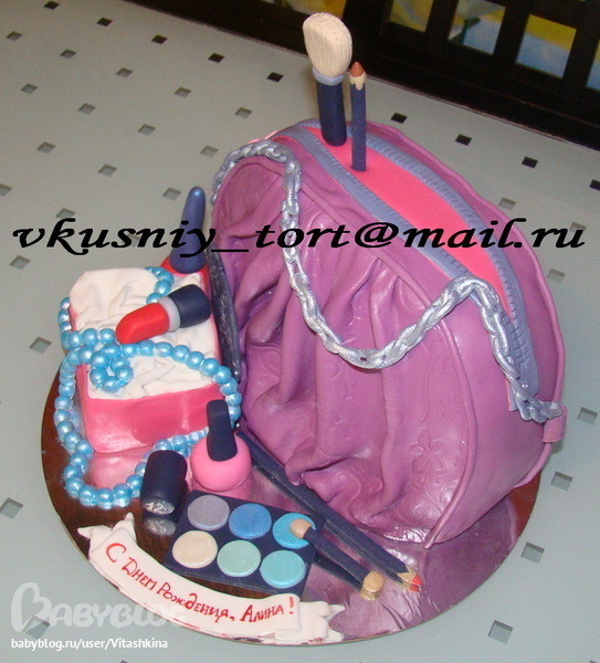 Торты для женщинИмениннице 12 лет и она ОЧЕНЬ любит: фиолетовые сумки, косметику и голубые бусы :)