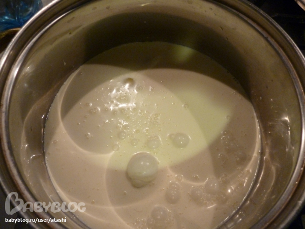 Вылить молоко с мукой в подогретую смесь в кастрюле.