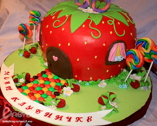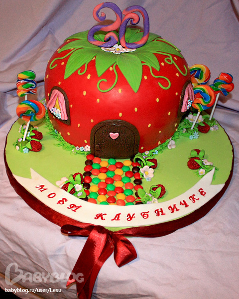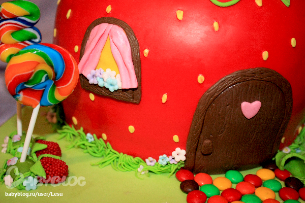 Ещё было пожелание по максимуму украшения сделать НЕ из мастики, заменить чем-то. Поэтому дорожка из M&M's, леденцы на палочке покупные, ягодки мармеладные. В общем вот такой клубничный домик)))