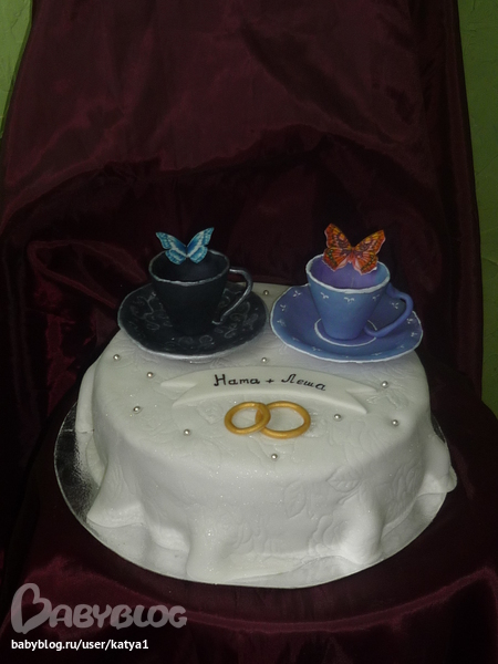 Торты свадебныеВот такой тортик заказали на фарфоровую свадьбу, предупредили сразу чтоб никаких цветочков и листочков, никаких веточек и украшений, а только две чашки черного и сиреневого цвета и колечки, это я уже от себя сделала оттиски на белой скатерти а то ну совсем голо как то, во. Внутри ванильный шифоновый бисквит, ванильный крем с клубникой, пропитка белис+сгущенка и чудо молоко ванильное, вес 3 кг