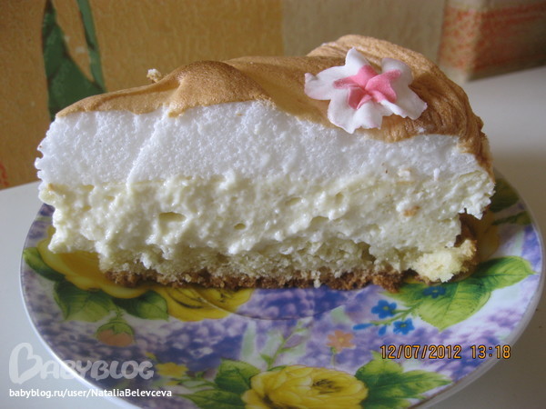 Вынуть тесто из холодильника и выложить в форму (диаметр - 23 см) слоем полсантиметра. Наверх выложить творожную начинку. Выпекать при тем. 180 гр. на протяжении 30 мин. Затем вынуть, сверху выложить суфле (взбить белки с сахаром) и печь еще 10-15 мин. до золотистого цвета.