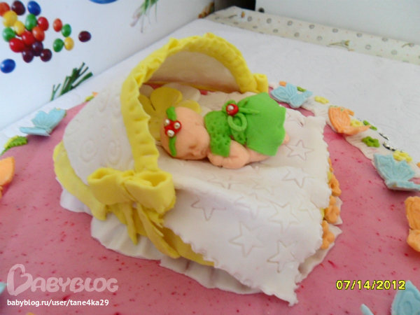 Тань, с мастикой ты сама все поняла. Выровняла хорошо! Но... Тань, у тебя в торте слишком много цветов намешано. Хотя бы голубых бабочек заменить на желтых или белых. Торт по цвету не получился единым. Во всем остальном - явный прогресс!