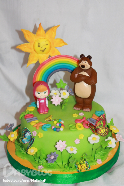 Добрый вечер. Напишите в личку цену такого торта. Единственное вместо Маши и медведь нужна сладкая фигурка пони.