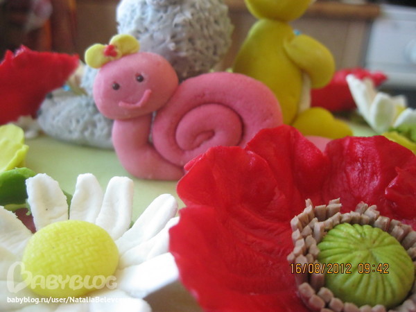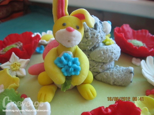 История этого тортика такова: к заказчикам (я из Украины) приезжают родственники из Москвы, нужен тортик с символикой России и Украины (поэтому внизу флаги), но так как в семье маленькие дети (девочки) нужно еще много цветочков и зверюшки