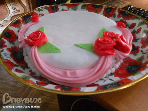 По торту - выровнять в следующий раз поглаже, особенно переход на бока. Мастику чуть покруче замешивать - складочки будут лучше получаться, у тебя они провисли и сошлись все вместе.