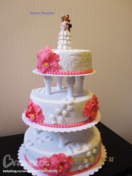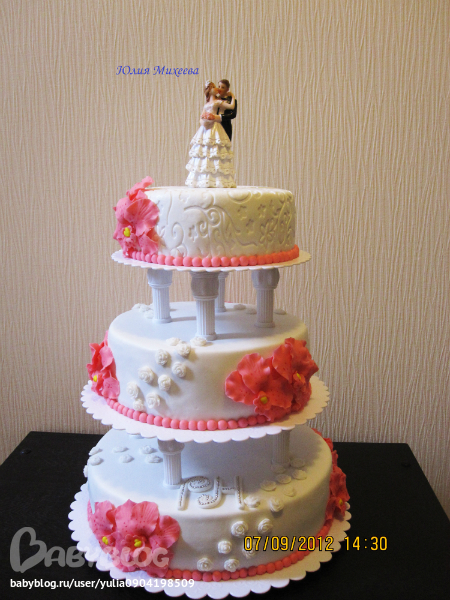 Торты свадебныеМой 2 свадебный!!!!! Низ - Ванильный шифоновый бисквит, Шоколад на кипятке с йогуртовым кремом и персиками, 2 этаж - Генеральский торт (изюм, орехи, мак) с крем-брюле, верх - Молочная девочка с Маскарпоне и ананасом, 11 кг