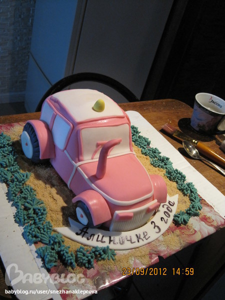 похожа на машину в стиле ретро) а зачем алиночке трактор? убрать бы трубу а на капот посадить плюшевых зверят из мастики и сзади бантик на багажник.