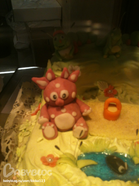 Рядом с моим домом есть один сетевой магазин и там продается вот такое нечто,если кто не узнал это лунтик и компания.Это нечто продается по 1120руб за кг,без фигурок просто обтянутый мастикой торт,а фигурки по 100руб за штучку.А вот и они,красотищаааааааа........