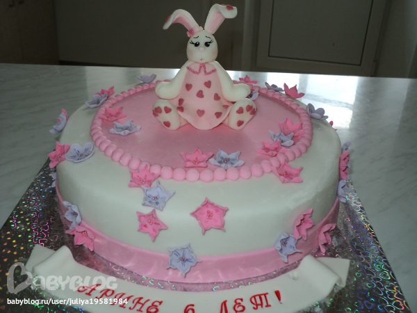 красивый зайка и тортик в целом!Я тоже люблю тортики Инны,такие всегда необычные они у неё. Юля из какой мастики делаешь в основном- обтягиваешь,лепишь(например этого зайку)?Молодец ты,недавно начала и уже такие тортики делаешь!!!!!!!!!