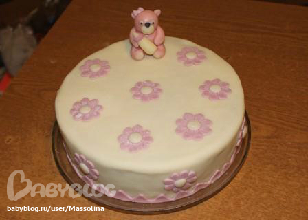 Привет. Спасибо))))Вырезала формой для печенья , разрезала лепестки и придала форму лепестков ножом,наклеила посередине круглешок. Мишку сама лепила,правда он у меня немного стек вниз, мастика быстро таяла.
