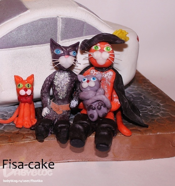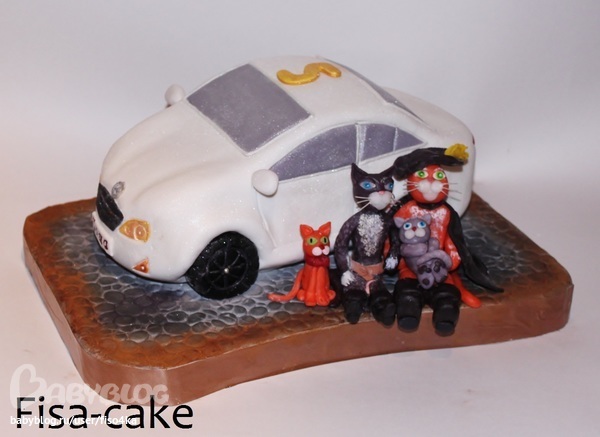 Заказали торт для мальчика 5-ти лет ...взрослую машину и кошек...... Я вспомнила про Лениного кота с кисой мягколапкой......и очень захотелась его сделать.... Конечно он не такой красивый получился.....но я старалась:)... Изначально планировался кабриолет.....но когда стала вырезать места, что б посадить фигурки, поняла, что торта будет очень мало..... так кабриолет превратился в Мерс...... правда надо было сделать его ниже....но побоялась его образать.....а то у меня всегда так......начну переделывать...вообще всё испорчу(((