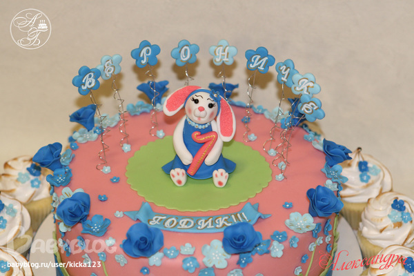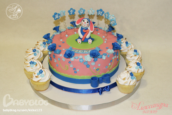 С юбилеем!!!! Красивый тортик,зайка и капкейки!!! Придумка с подложками хорошая.